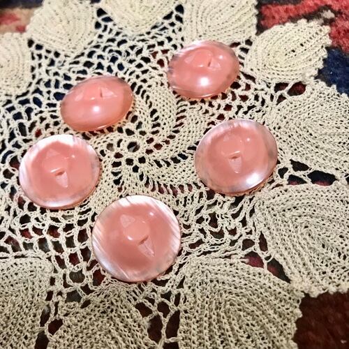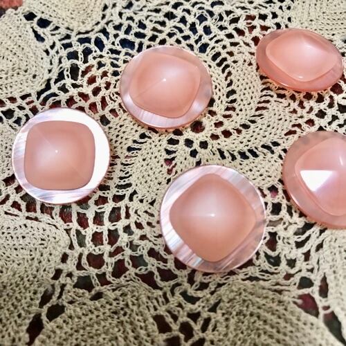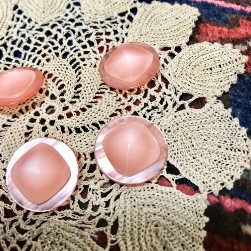 ミルキィな淡いピンクが可愛いらしく、中央がスクエア、外側はサークルのデザインも海外らしい、素敵なデザイン。お洋服の中で存在感大になりそうなボタンです。
