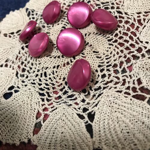 チェリーピンクの何とも言えない美しい色合いのボタン。凹凸があり、存在感抜群。お洋服のワンポイント、ヘアゴムなどにもしていただけそうです。