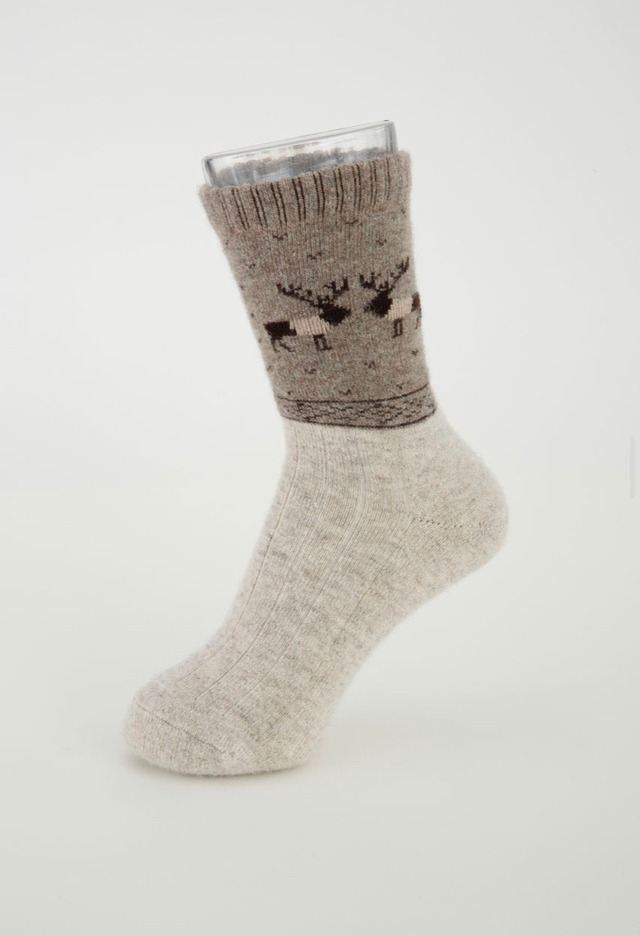モンゴルで生まれ育った羊の天然ウールあったか靴下。マイナス40度の厳寒でも保温性バツグン。自然素材羊ウール100%なのでラクダウール100%、ヤクウール100%のように柔らかく、暖かさは羊の毛そのものです。冷え性対策のお奨めアイテムです。冷え性に悩んでいる方はぜひ履いてみてください。ルームソックスとして使えるし、もちろんアウトドア用としても最適です。可愛いトナカイ柄も人気ですよ。