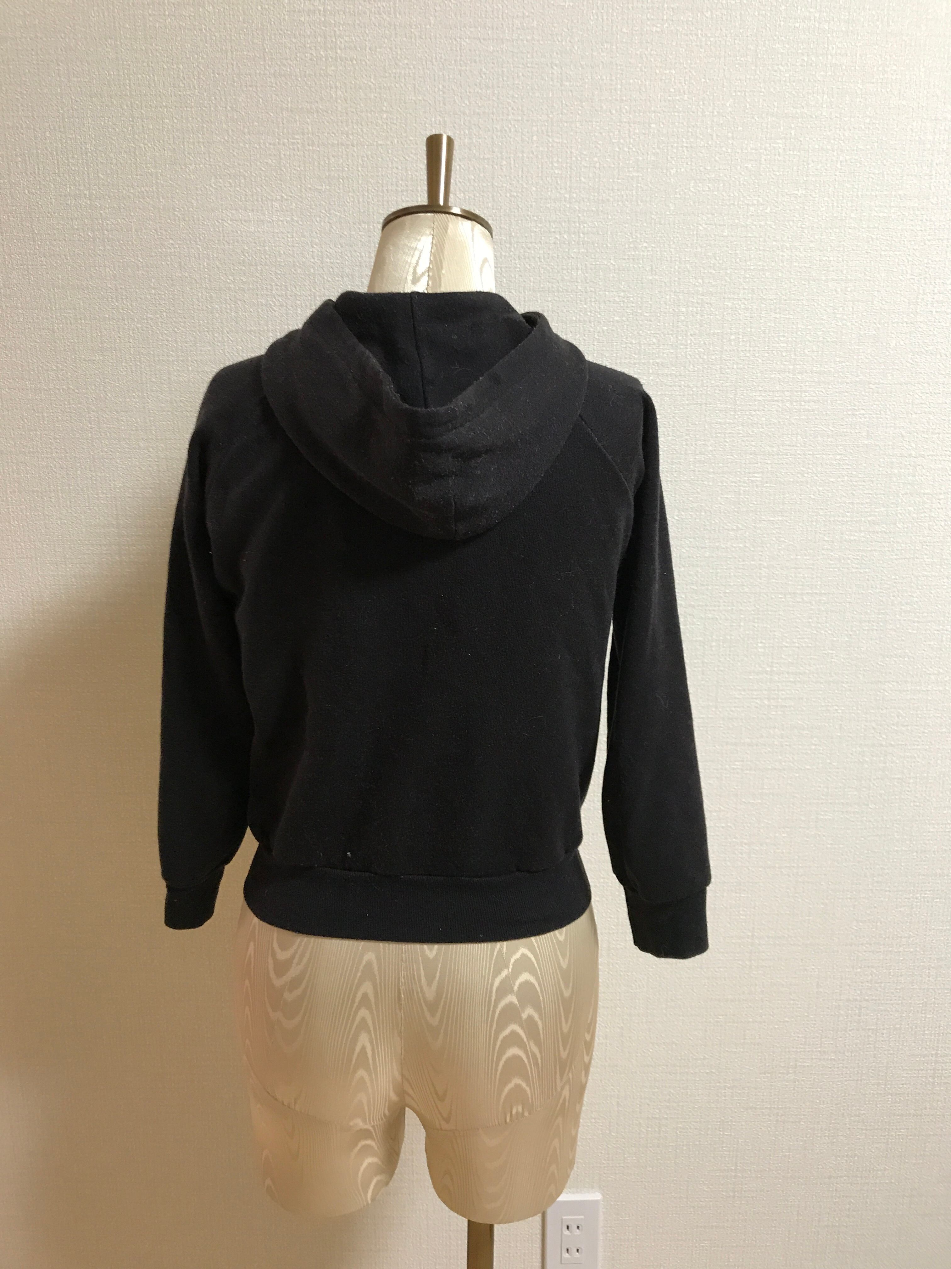 アメリカ買い付け品。ボーイズサイズのブラックパーカー。パーカーはダボっとなりがちですが、ボーイズサイズですので、レディースで着ていただくとジャストサイズに。上半身がコンパクトシルエットですので、ロングスカートやスカートの長いワンピースなどとも、バランスよくコーディネートしていただけます。ボーイズサイズですので、袖丈も短めで、ブレスレットをつけていても、ちょうど見える長さです。